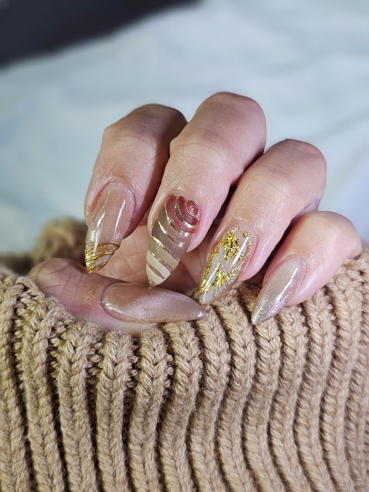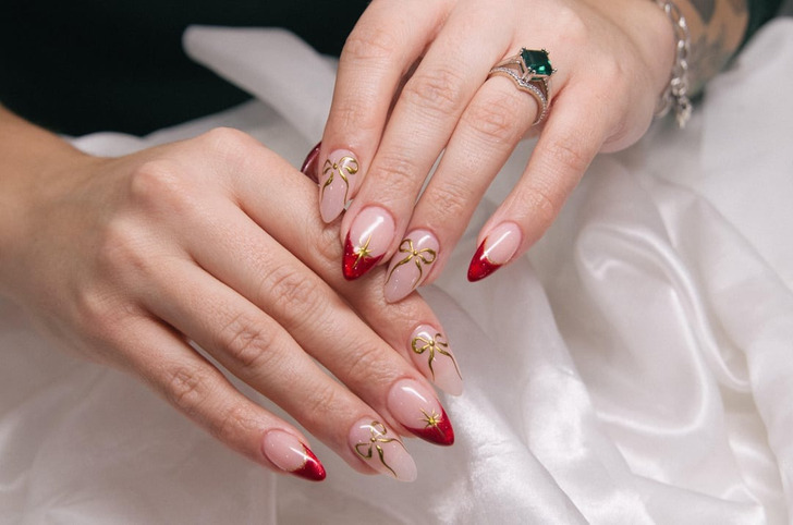 Эксперты назвали золотые акценты воплощением роскошного дизайна для праздников. Это может быть небольшой акцент у кутикулы, незамысловатый бантик или даже линия у кончика ногтя.