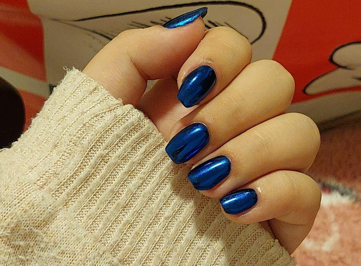 Один из самых популярных зимних цветов — синий, в частности металлик. По словам экспертов, темно-синий или сапфировый с хромовым покрытием — это утонченная вариация классического зимнего темного маникюра.