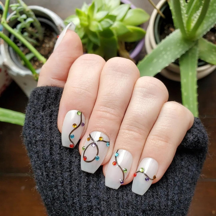 Праздничные гирлянды привлекают взгляд, так почему бы не добавить их в свой маникюр? Это как глоток свежего воздуха среди классических зимних дизайнов. Эксперты рекомендуют использовать тонкие, изящные линии с небольшими стразами для изображения гирлянд. А вы бы решились на такой дизайн?
