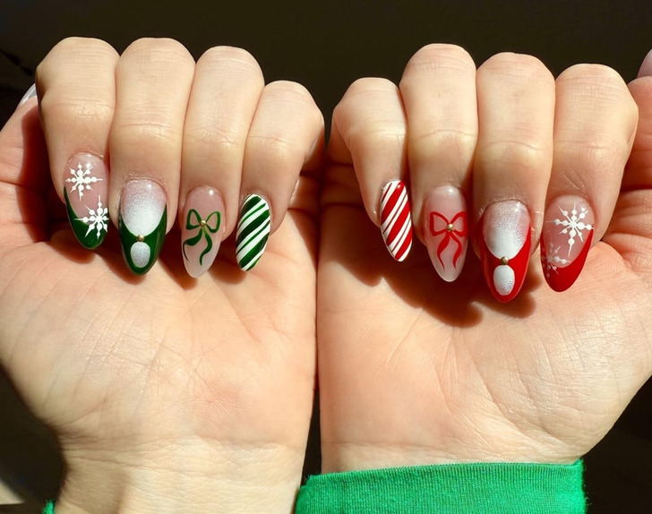 Дизайны, навеянные зимней тематикой, сейчас на пике популярности. Снежинки, елочки, бантики, гирлянды. Кроме того, стоит обратить внимание на принт в стиле леденцов. Он легко вписывается в общую красно-белую палитру.