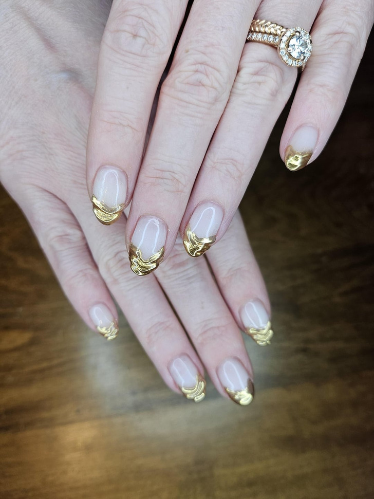 Кстати, о золотых деталях! Золотой френч — идеальный вариант для зимних праздников. Он смотрится свежо и изысканно. Этот дизайн даже появился на красной дорожке в исполнении мастера Золы Ганзоригт. С золотым френчем вы будете выглядеть как королева!