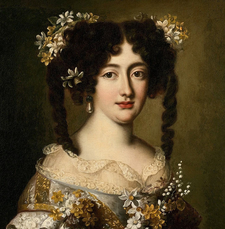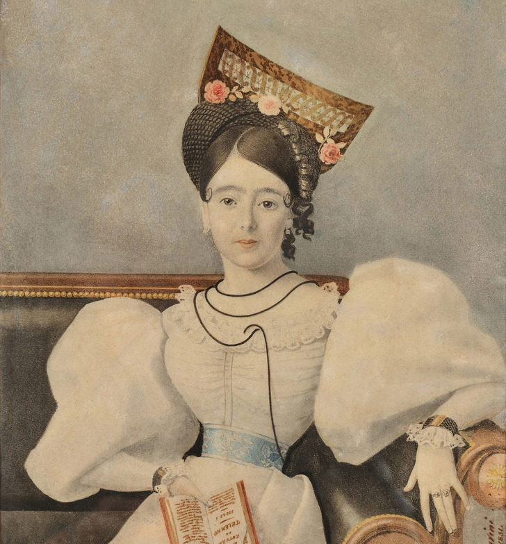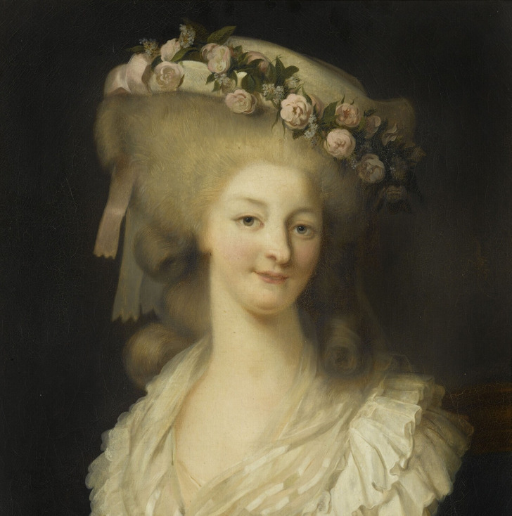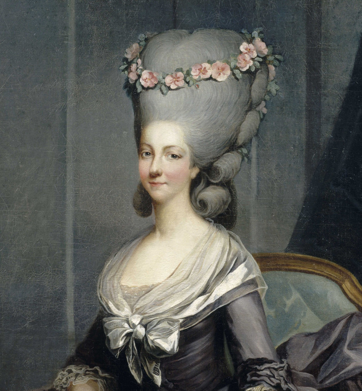 На портретах выше изображена принцесса де Ламбаль с практически каноническим ежом на голове — за исключением цветов, которые она вплела в прическу.