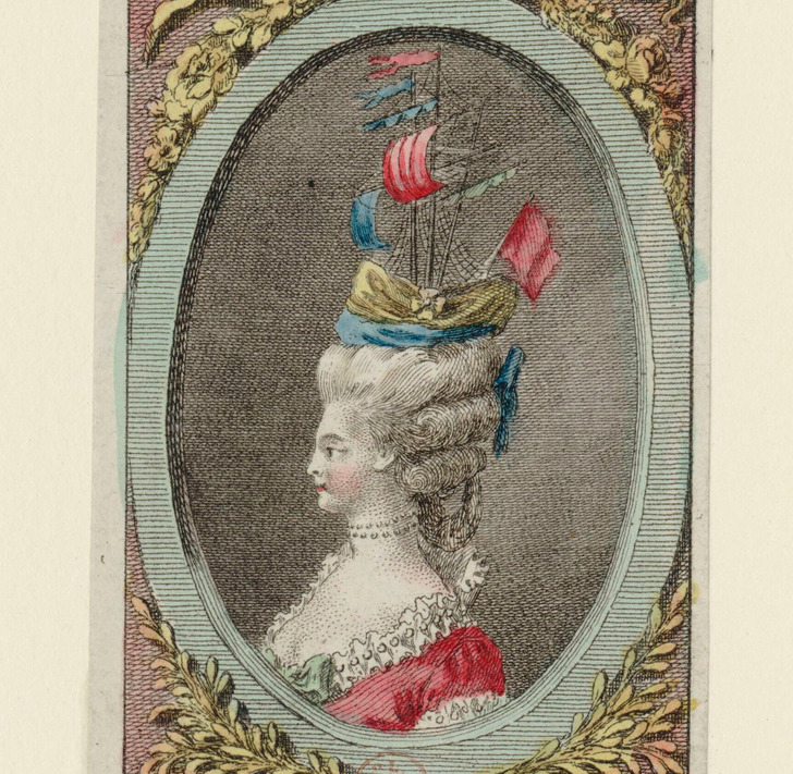 Еще одна композиция, произведшая фурор при дворе, называлась «Coiffure à la Belle-Poule». Она изображала настоящую модель корабля, плывущего по волнам из волос, а создана была в честь победы знаменитого французского фрегата La Belle Poule в морском сражении.