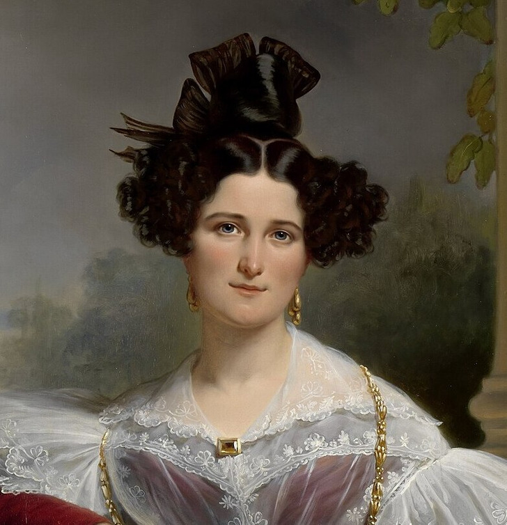 Эта прическа вошла в моду примерно в середине 20-х годов 19 века. Волосы укладывались в три этапа. Спереди их разделяли пробором, завивали и укладывали по бокам. Оставшиеся на затылке волосы зачесывали наверх и завязывали в особый узел, который иногда называли короной.