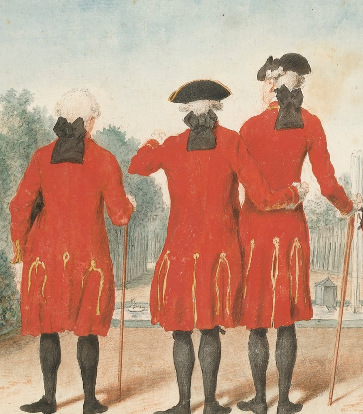 Причудливая мода не обошла стороной и мужчин. В начале 18 века в моду вошло несколько видов мужских причесок. Одной из них был парик в мешке — длинный хвост убирался в специальный мешочек, который пришивали к парику сзади.