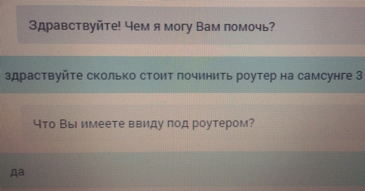 «Здравствуйте! Чем я могу Вам помочь?» — «Здравствуйте, сколько стоит починить роутер на самсунге 3». — «Что Вы имеете в виду под роутером?» — «Да».