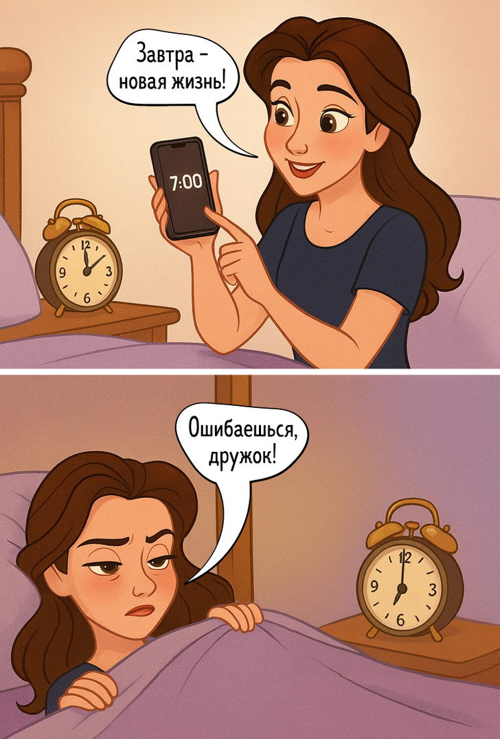 5. А перед сном решаем: «Завтра мы меняем все, начиная с первого луча солнца...» А утром косо смотрим на будильник, прежде чем демонстративно обернуться и сделать вид, что ничего не произошло.
