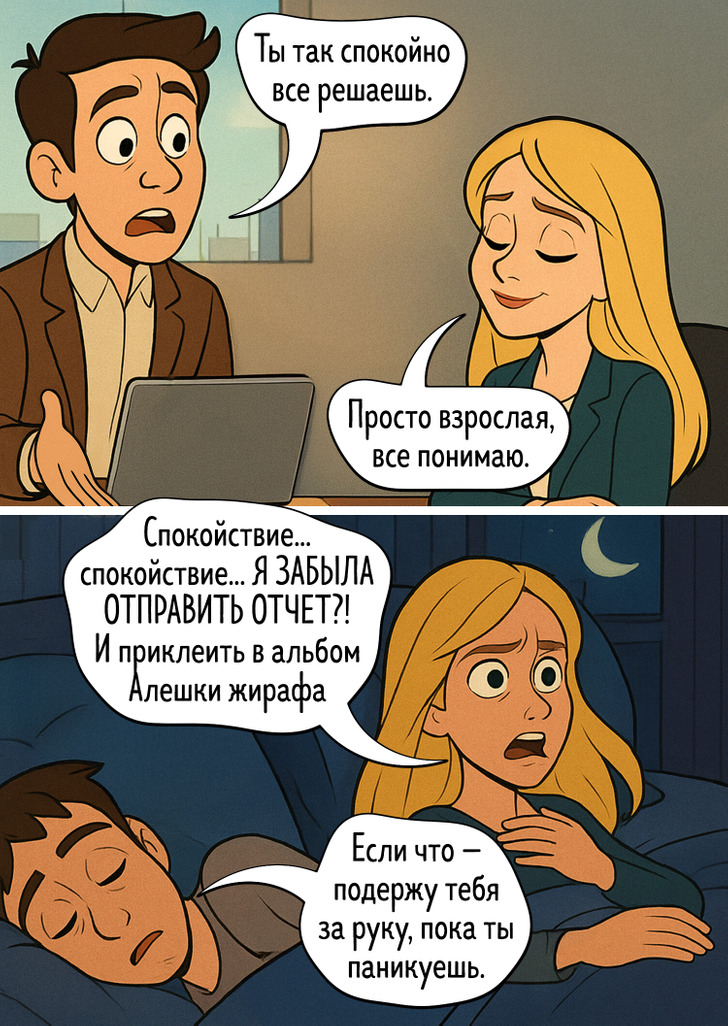 1. На работе мы сохраняем спокойствие, коллеги нами восхищаются, а дома ночью вдруг вспоминаем, что половину дел совсем забыли, и дедлайн давно прошел...