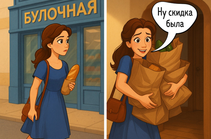 Это про меня. Зашла сегодня за сметаной. Купила: пол-батона, куриную грудку, фарш, сливки, морковку, икру кабачковую. К счастью, на кассе вспомнила, за чем я всё-таки приходила. 😁 Поэтому я хожу в магазин со списком. Сегодня просто зашла по пути.
