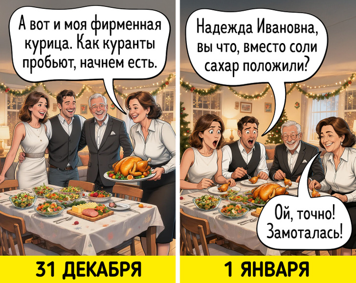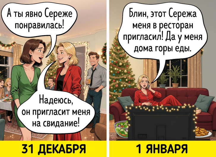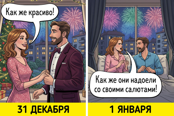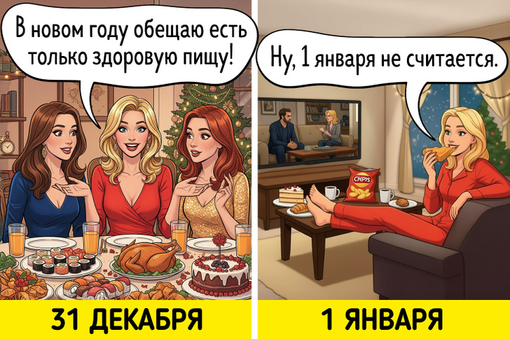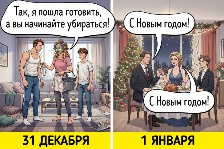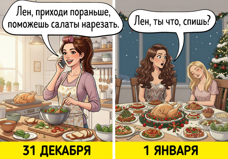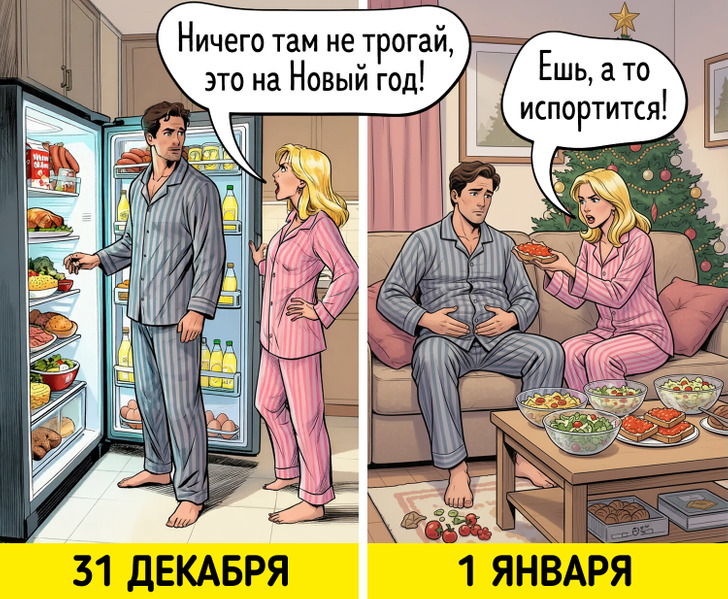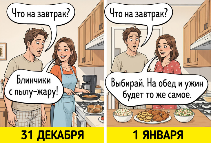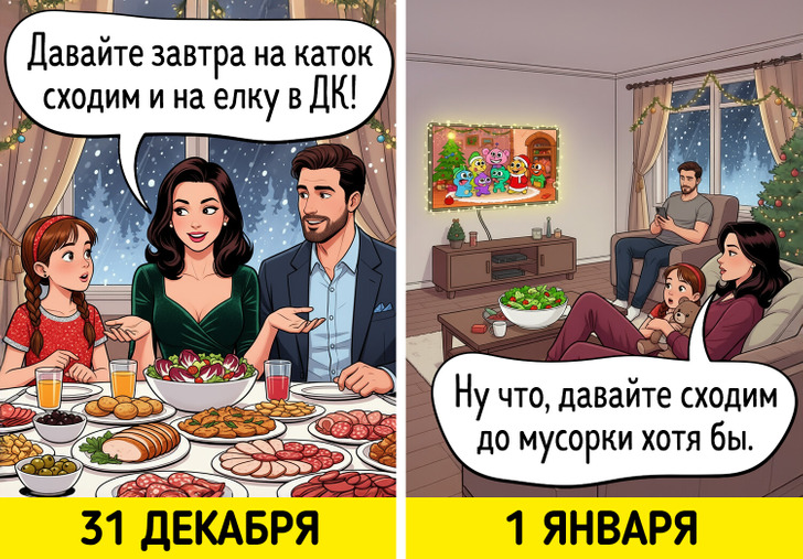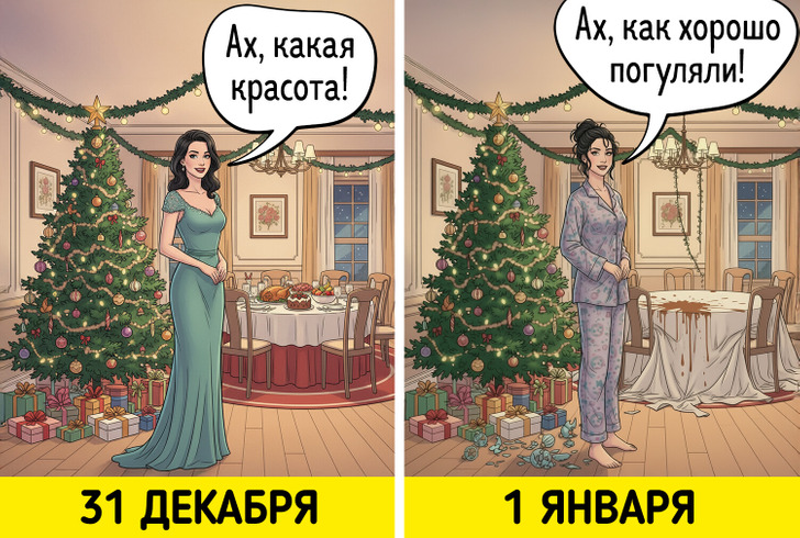 Новый год — чудесный праздник, который наполнен предчувствием волшебства, светлыми надеждами и радостью от встреч с друзьями и родными. К долгожданному 31 декабря и подготовка идет серьезная и масштабная. От этого-то следующий день выглядит и ощущается, мягко говоря, иначе. И мы решили нарисовать об этом комиксы.