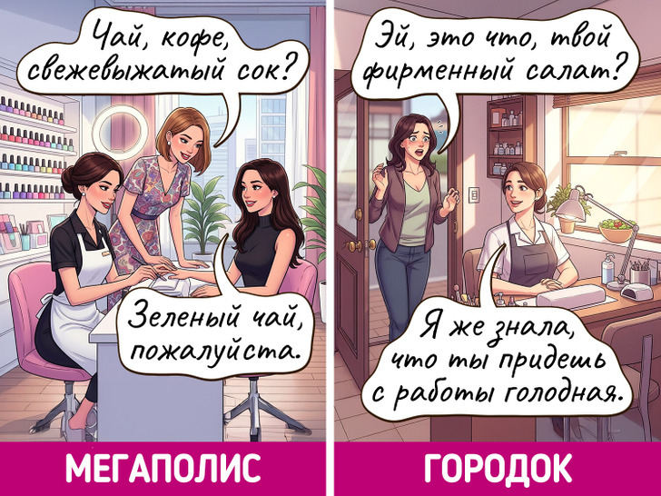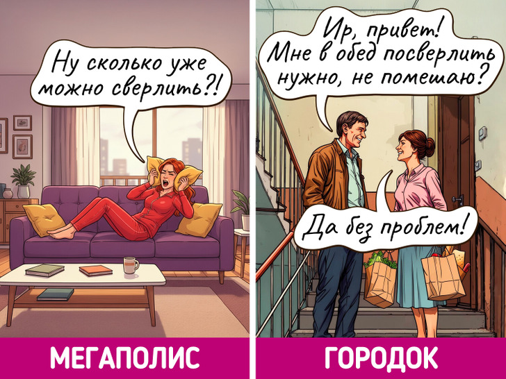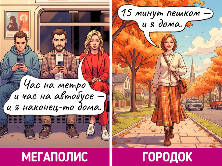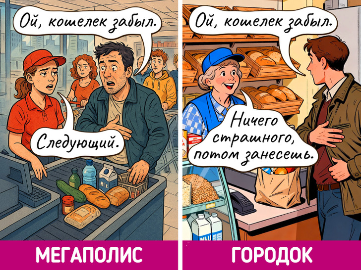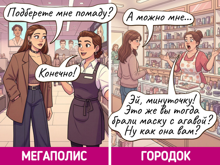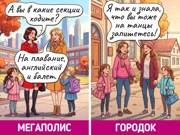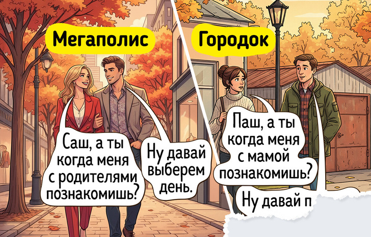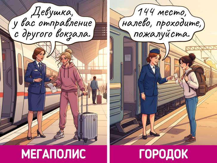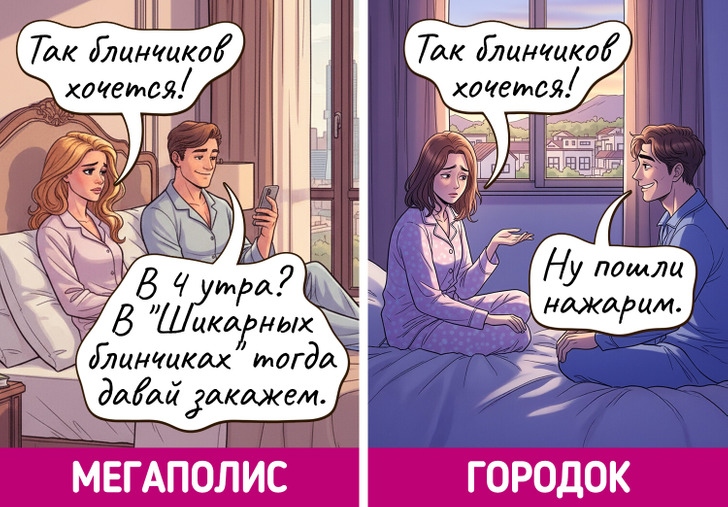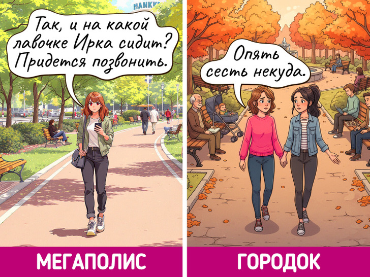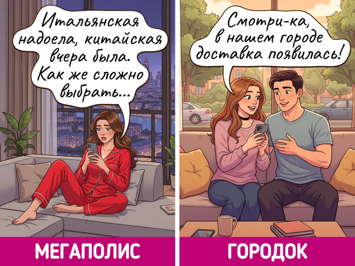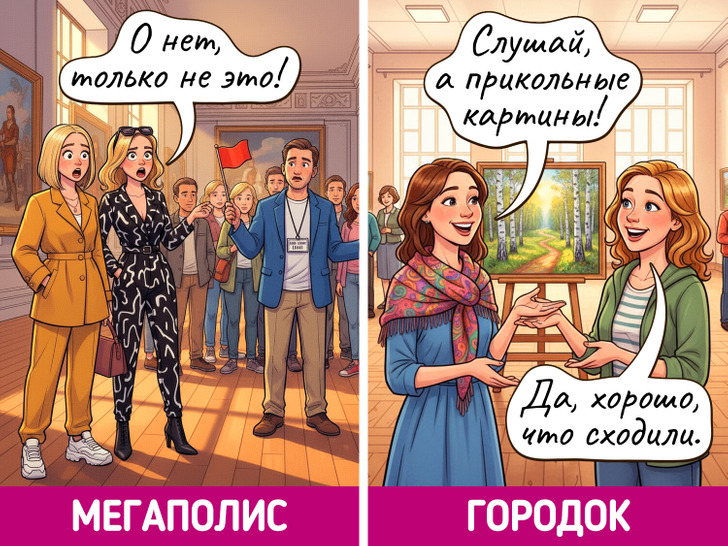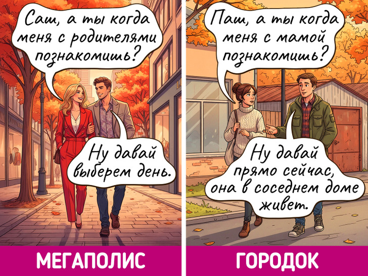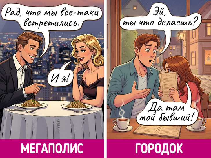 Жизнь в мегаполисе похожа на сериал — каждый день новые лица, события и кажется, что все возможно. Но и в маленьких городках есть свое очарование, пусть там и редко что-то меняется. Мы решили нарисовать комиксы о том, насколько по-разному может выглядеть одно и то же событие в крупных городах и в провинциальных.