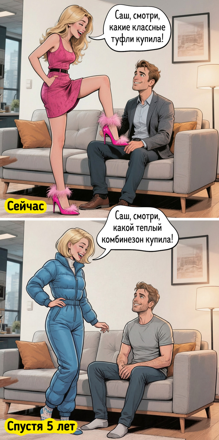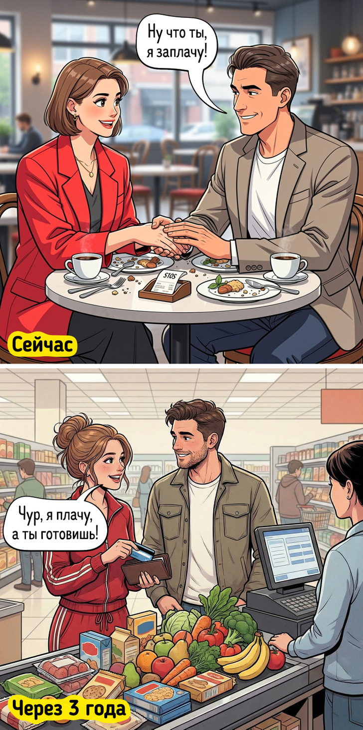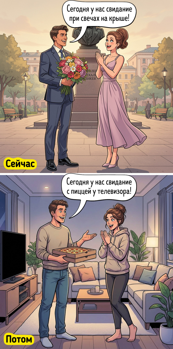 Любовь и отношения — это не только романтические прогулки и вздохи при луне. Это постоянное столкновение миров мужчины и женщины. Порой трогательное, а порой уморительное. Мы решили, что будет здорово нарисовать об этом легкие комиксы, а помог нам с этим искусственный интеллект. Возможно, некоторые сценки покажутся вам до боли знакомыми.
