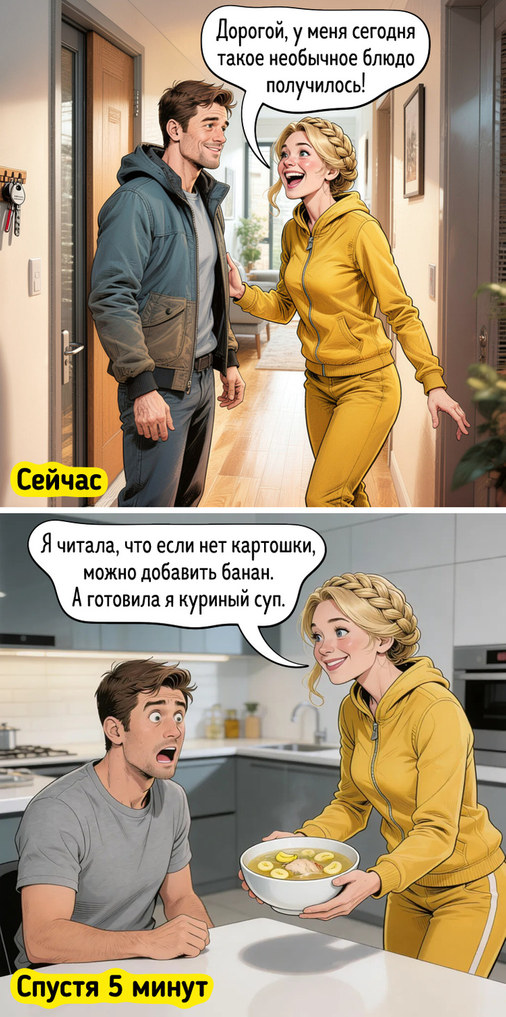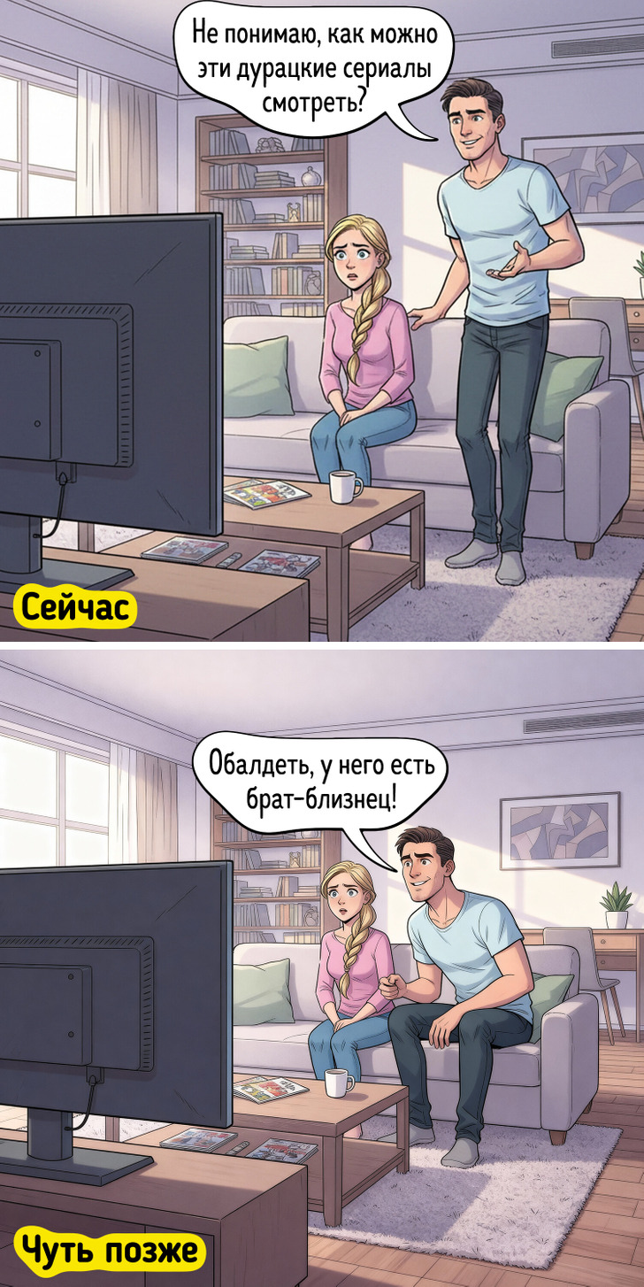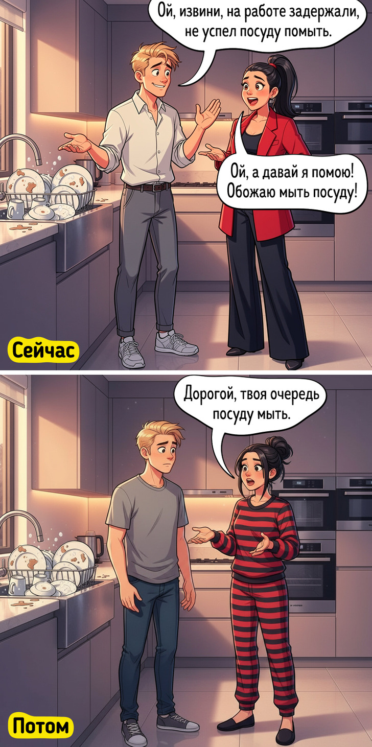 Любовь и отношения — это не только романтические прогулки и вздохи при луне. Это постоянное столкновение миров мужчины и женщины. Порой трогательное, а порой уморительное. Мы решили, что будет здорово нарисовать об этом легкие комиксы, а помог нам с этим искусственный интеллект. Возможно, некоторые сценки покажутся вам до боли знакомыми.
