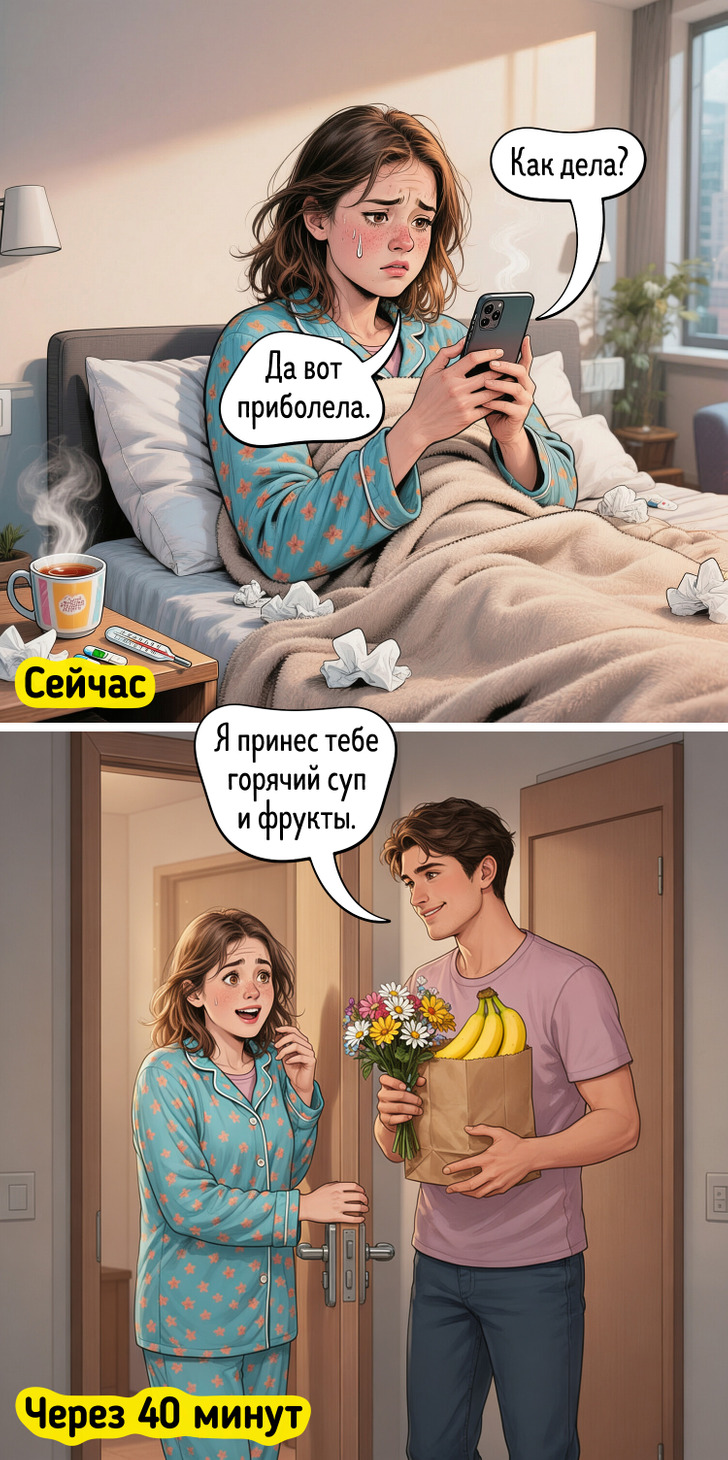 Настоящая забота — это когда узнав, что ты болеешь, твоя вторая половинка тут же бежит к тебе на помощь