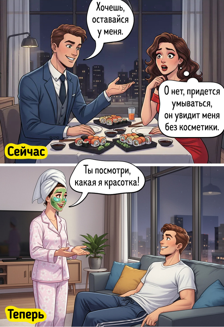 В начале отношений мысль, что вторая половинка может увидеть тебя не при полном параде, может пугать. Со временем это проходит