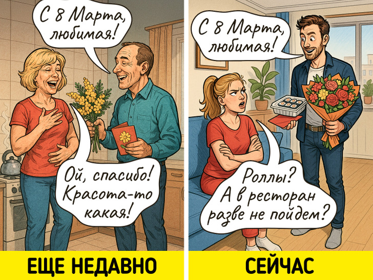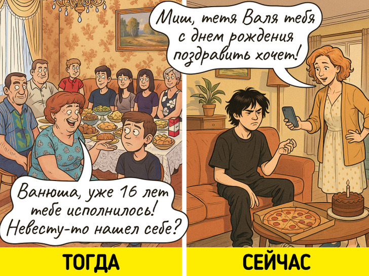 Новый год, 8 Марта, день рождения — да мало ли у нас праздников! И с каждым из них у нас связаны определенные традиции. Но с течением времени большинство из них сильно изменилось. Вот мы и подумали, что будет здорово нарисовать об этом комиксы.