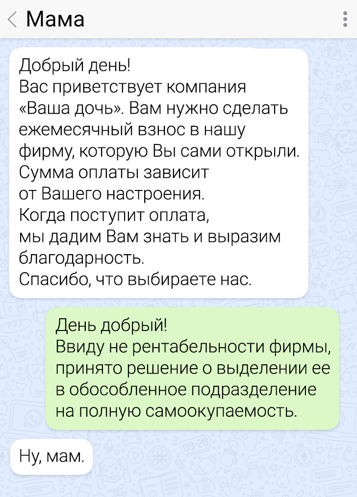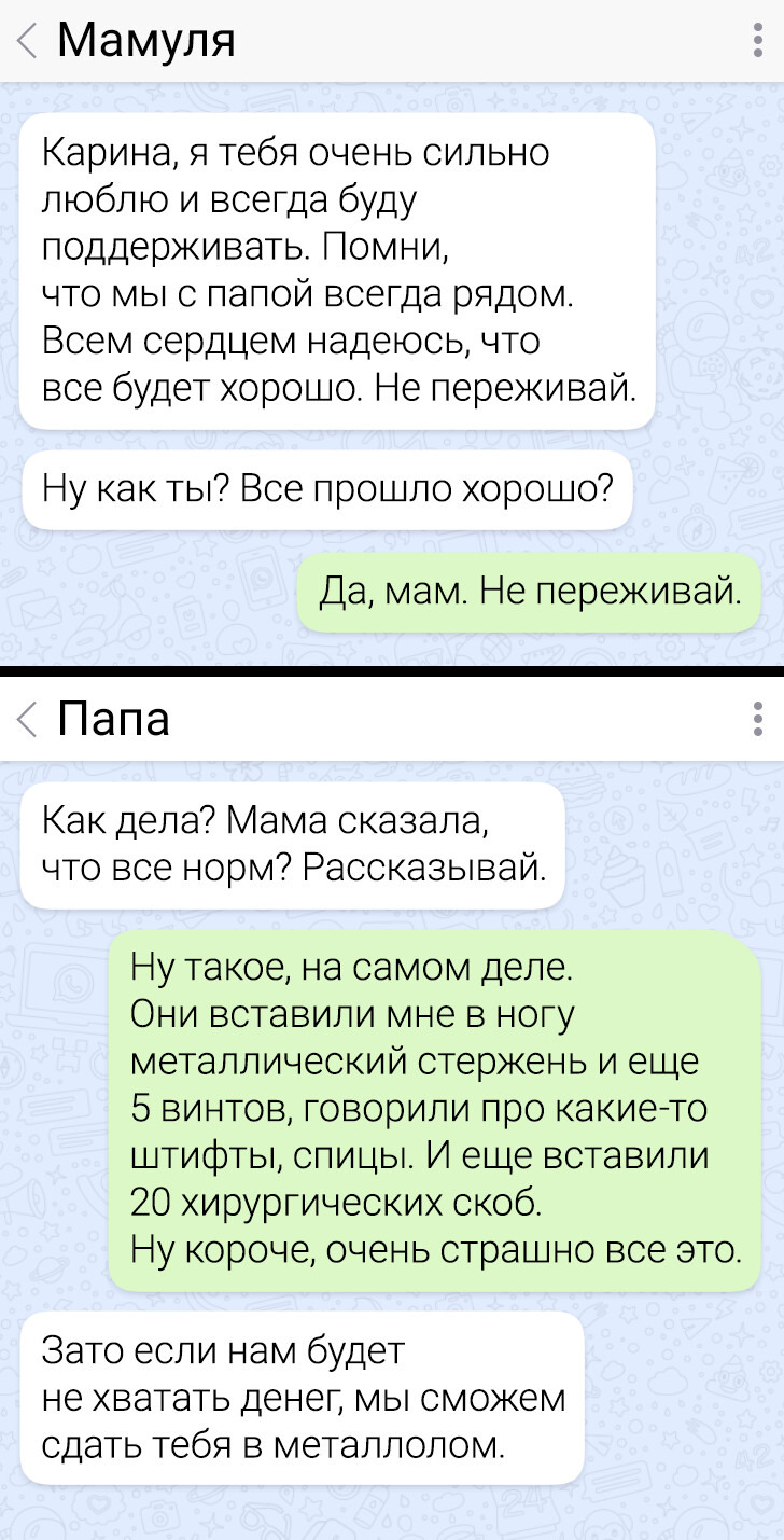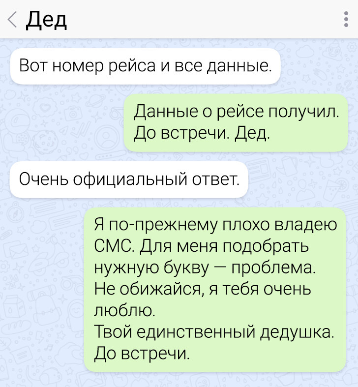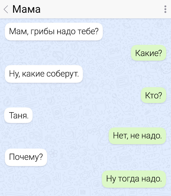 Если вы думаете, что ваш чат с родственниками скучен, вы сильно ошибаетесь. Потому что именно в СМС-переписках рождается самый абсурдный, но гениальный юмор. Мы собрали 15 диалогов, в которых родственники и супруги с юмором подходят к любым ситуациям — от замужества до тушенки. Приготовьтесь, вам захочется переслать это своим близким!