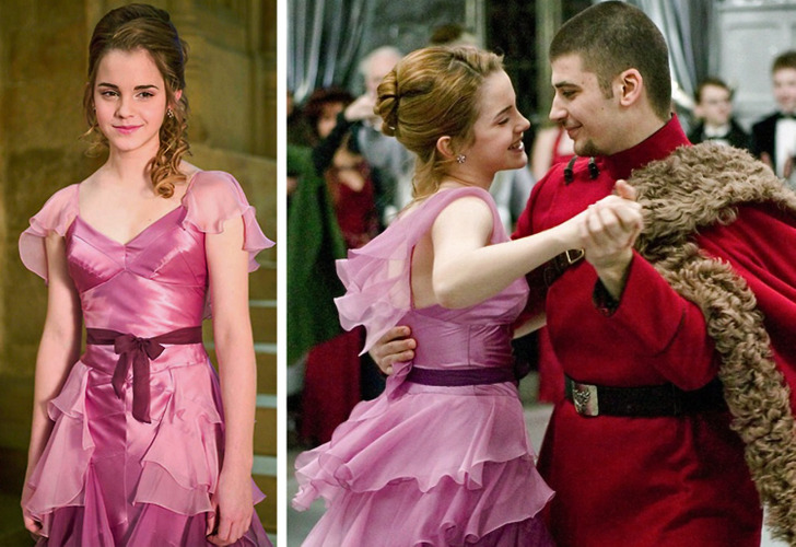 Нежное розовое платье с летящими оборками — первый по-настоящему женственный образ Гермионы в экранизации поттерианы и ее первое платье во всей серии фильмов. Благодаря ему, ну и конечно, прическе, Гарри и Рон наконец замечают, что она — не только подруга и отличница, но еще и привлекательная девушка.