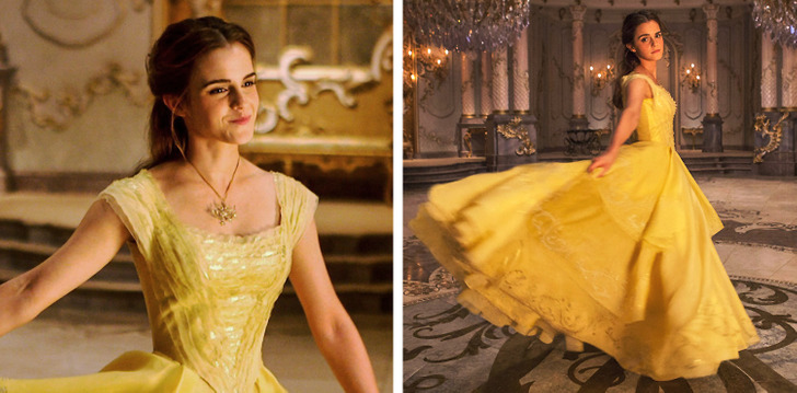 То самое желтое бальное платье из диснеевского мультфильма «Красавица и Чудовище» было перенесено в фильм, но с небольшими изменениями. Эмма Уотсон хотела создать образ современной, сильной и смелой Белль, но прежнее платье принцессы настраивало совсем на другой лад. Художница по костюмам Жаклин Дюрран постаралась найти баланс между нежным кукольным платьем и новым прочтением образа главной героини.