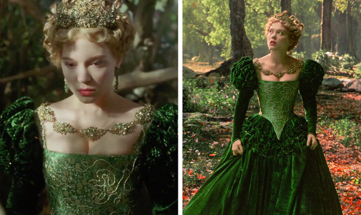 По-настоящему королевское изумрудно-зеленое платье Белль надевает, когда попадает в замок Чудовища. Именно в нем она блуждает по лесу и находит могилу девушки-лани, возлюбленной хозяина замка. Это платье, как и другие костюмы фильма, созданные Пьером-Ивом Жиро, сочетают в себе элементы стилей ампир и ренессанс.