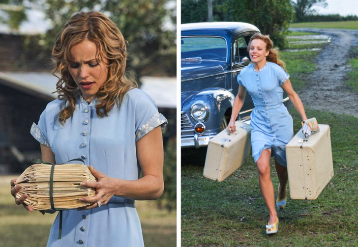В этом простом, но изящном платье на пуговицах Эллисон возвращается к Ною. И когда они наконец встречаются, разворачивается одна из самых запоминающихся романтических сцен — поцелуй под дождем. Художник по костюмам Карин Вагнер рассказывает, что попыталась отразить в этом платье эпоху и то, какой женщиной хотела стать главная героиня; а голубой — это цвет надежды.
