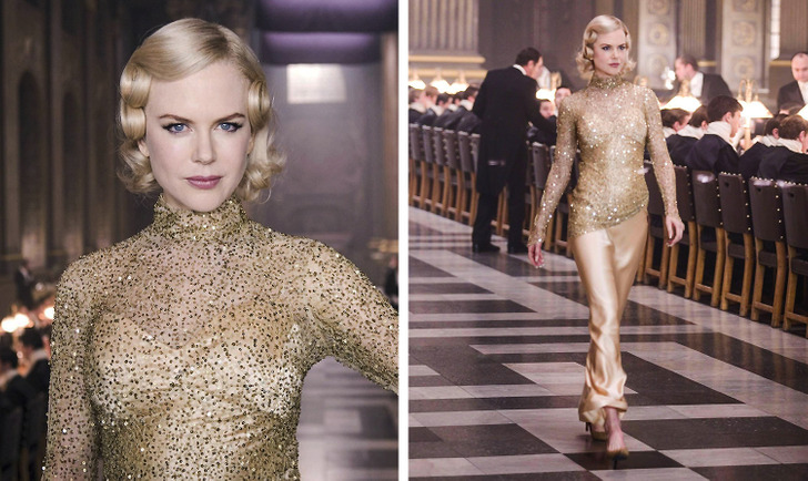 Золотистый чехол с пайетками поверх шелкового платья в бельевом стиле запоминается своей нестандартностью и вполне отражает образ миссис Колтер — красивой, но холодной, эффектной и влиятельной женщины. По словам художницы по костюмам Рут Майерс, она черпала вдохновение из старого Голливуда.