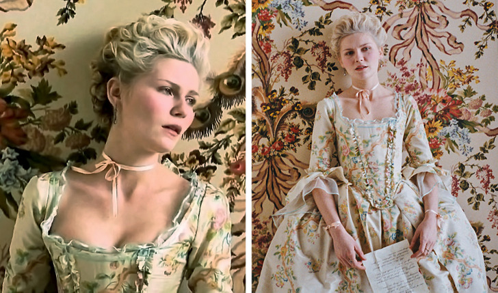 Художница по костюмам Милена Канонеро создала не просто одежду, выдержанную в стиле эпохи, а костюмы, которые придают истории дополнительные смыслы. Например, это платье с цветочным узором, который совпадает с узором на стенах, надето на Марии-Антуанетте, когда она читает неутешительное письмо из дома. В письме говорится, что у ее братьев и сестер уже рождаются дети, а у нее их все еще нет. Мария-Антуанетта подчиняется правилам жизни роскошного Версаля и буквально теряет себя, пытаясь исполнить чужую волю.