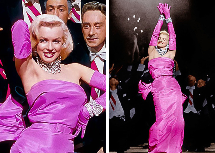 Самая гламурная блондинка 50-х Мэрилин Монро в великолепном платье-бюстье из розового атласа в сочетании с вечерними перчатками. Своим образом она очаровывает и зрителей, и публику в кадре, исполняя известный музыкальный номер «Бриллианты — лучшие друзья девушек». Впоследствии розовое платье стало модной иконой, и его неоднократно повторяли, в том числе Мадонна в клипе «Material Girl».