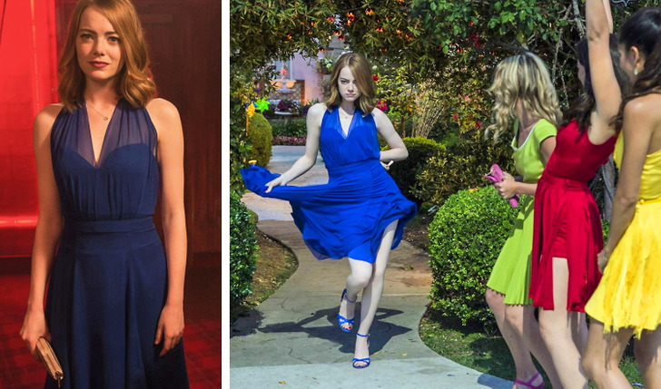Коктейльное синее платье в стиле ретро от дизайнера Мэри Зофрис героиня Эммы Стоун надевает на вечеринку, после которой встречает Себастьяна (Райана Гослинга). В фильме синий цвет означает творческий потенциал, который есть и у Мии, и у Себастьяна, одетого в синий костюм в той же самой сцене.