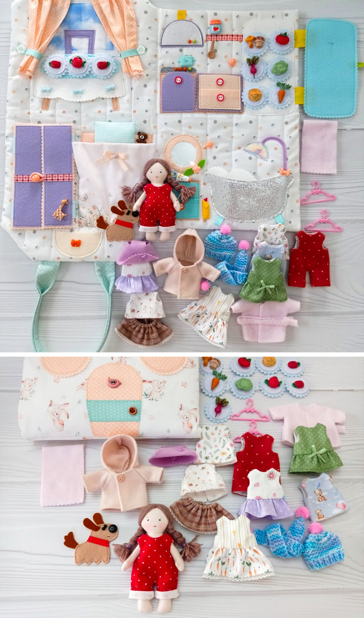 «У внучки скоро день рождения! Решила сшить ей в подарок вот такой домик-сумку с куклой и с одеждой»