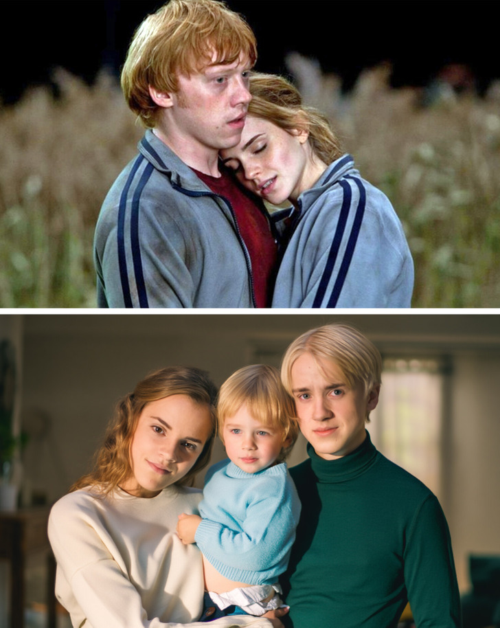 После победы над Волдемортом Гермиона поняла, что ее с Роном связывает лишь прошлое, и решилась на разрыв. Неожиданно она сблизилась с Драко, который давно искал искупления. Они поженились и родили ребенка. Их союз стал символом нового мира.