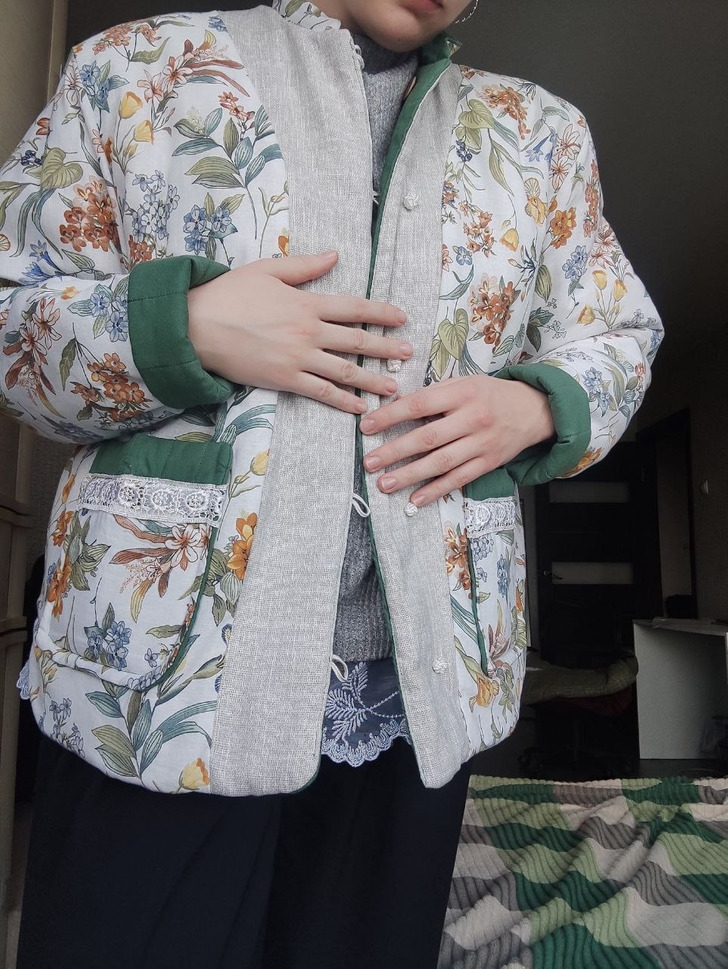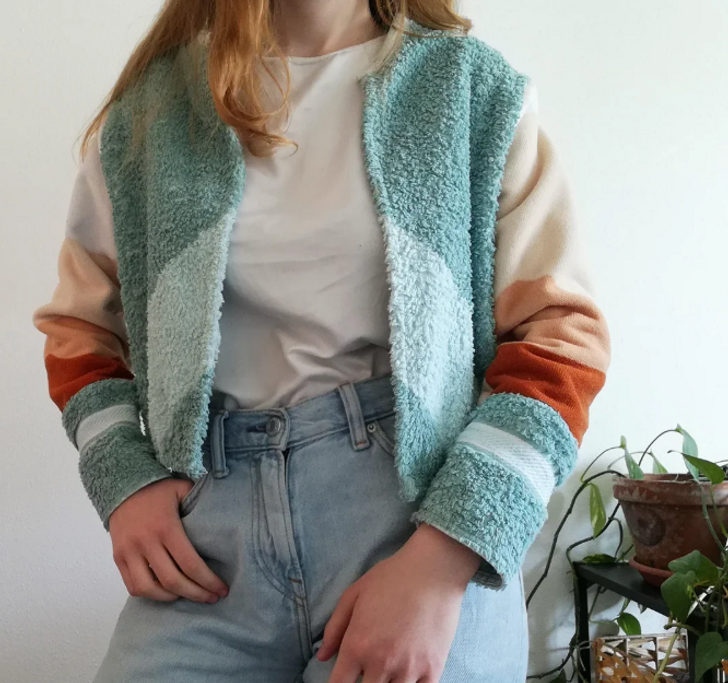 «Бабуля отдала мне несколько старых полотенец, а мне так понравились их цвета, что я решила сшить из них куртку»
