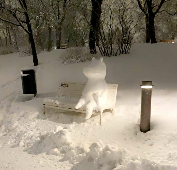 «В нашем парке кто-то слепил снежного Муми-тролля и посадил его на лавочку»
