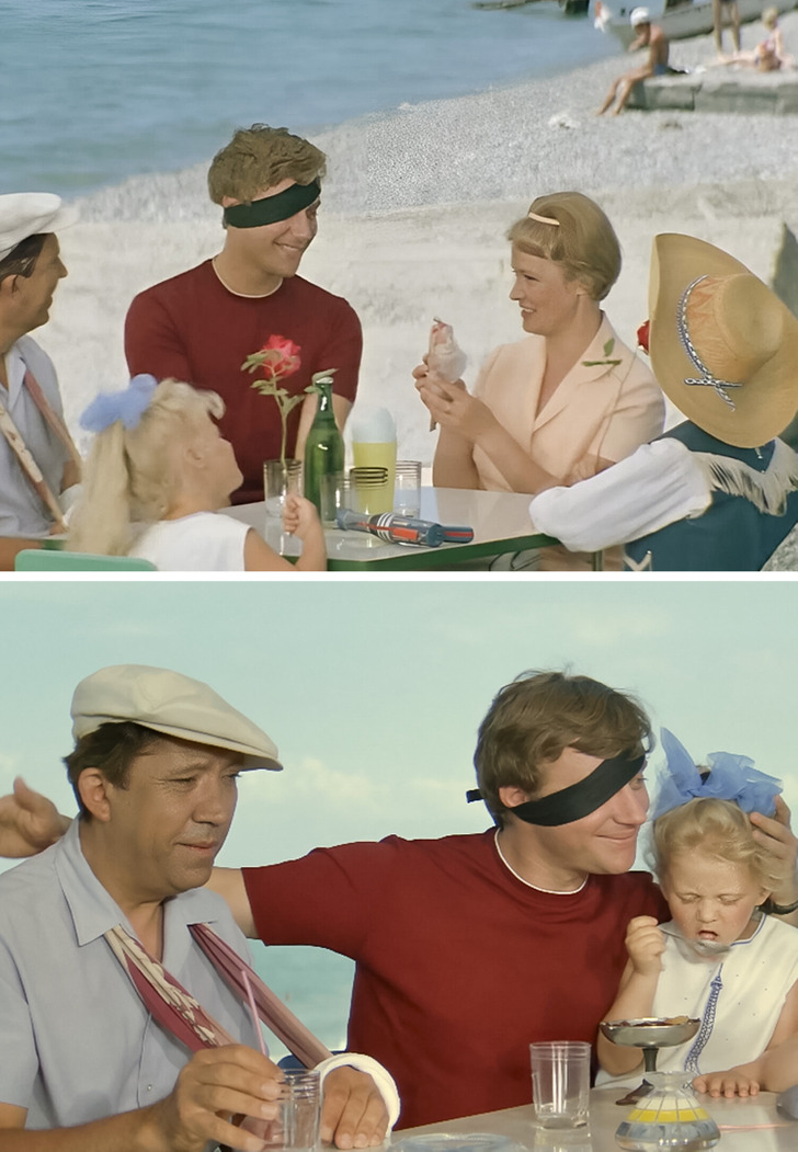 - Обратите внимание: Геннадий передает мороженое в рожке, а буквально через пару дублей мы видим, что дети едят его из специальных вазочек.