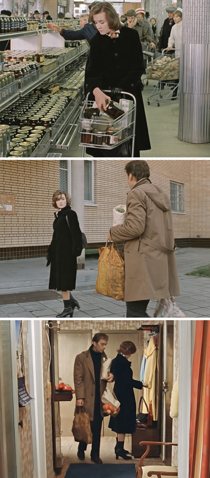 - Во второй части фильма мы видим, как Катерина делает покупки в магазине. В ее продуктовой корзине довольно много стеклянных банок. В следующей сцене она идет домой, и продуктов у нее в руках уже не так много, как в корзине. Однако после того как Гоша помог ей их донести, состав продуктов в авоське меняется.