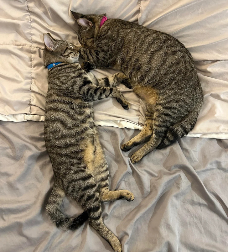 «Я нашла этих котят на лодочной станции, одному тогда было около 8 месяцев, а второму всего 8 недель. Отвела их к ветеринару и с тех пор забочусь о них. Теперь они живут свою лучшую жизнь со мной»
