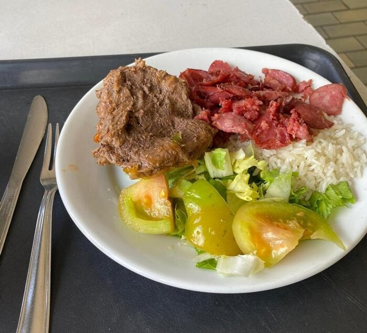 «Так выглядит бесплатный обед в бразильской заводской столовой. Столовка по типу шведского стола — то есть мяса я мог нагрести хоть полную тарелку. Кстати, говядина»