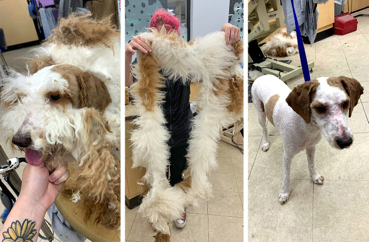 «Работаю грумером. Хозяйка сказала, что у песеля колтуны только на макушке. Но он был весь один сплошной колтун! Пришлось брить, и вот что из этого вышло»