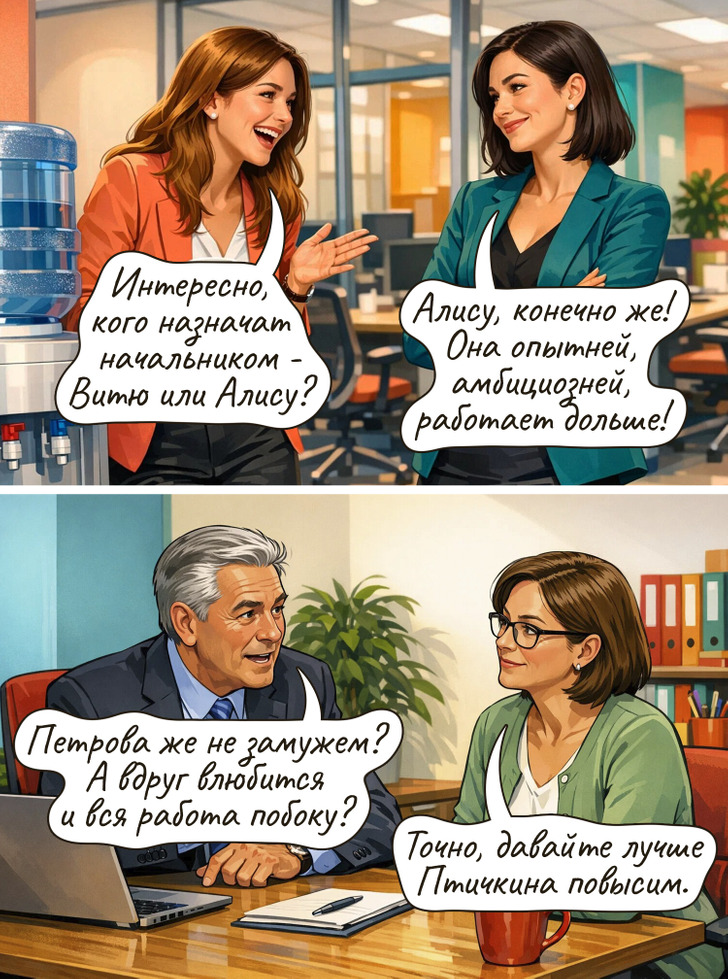 Начальство от мужчин, по умолчанию, ждет карьерных амбиций, а женщин подозревает в том, что они в любой момент бросят работу ради семейного очага