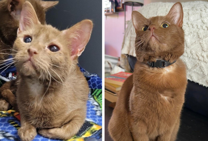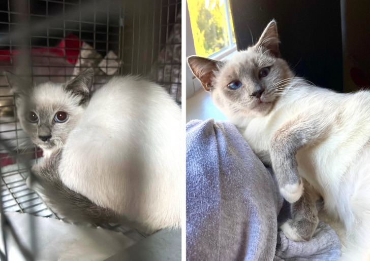 «Испуганный котенок „до и после“. Разница около 10 месяцев»