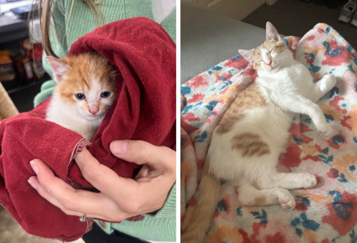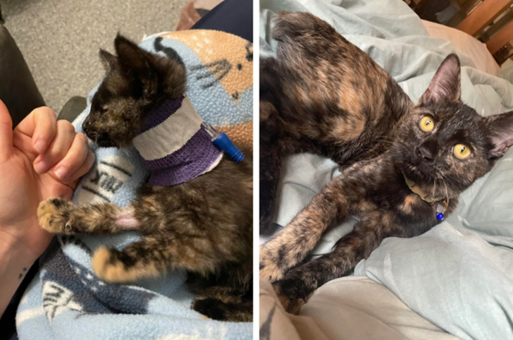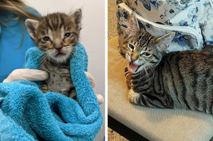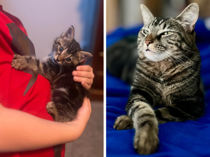 «Нашли этого малыша брошенным, с больной лапкой. Выхаживали как могли, окружили любовью и заботой. Спустя 7 месяцев он стал самым счастливым и энергичным котом, которого мы когда-либо видели»