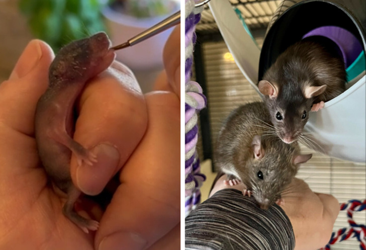 - На правой фотографии спасенный малыш — это крысенок, сидящий на руке автора. (прим. ADME)