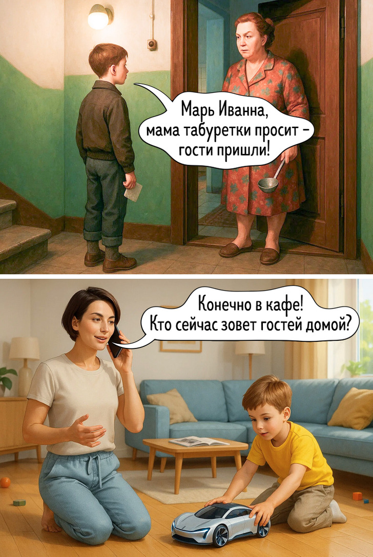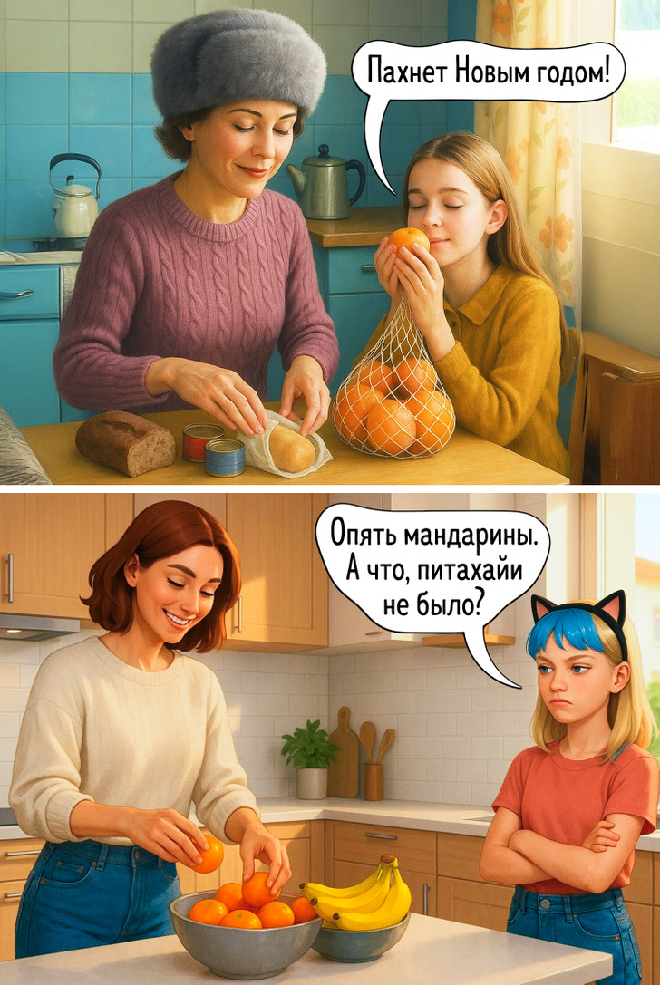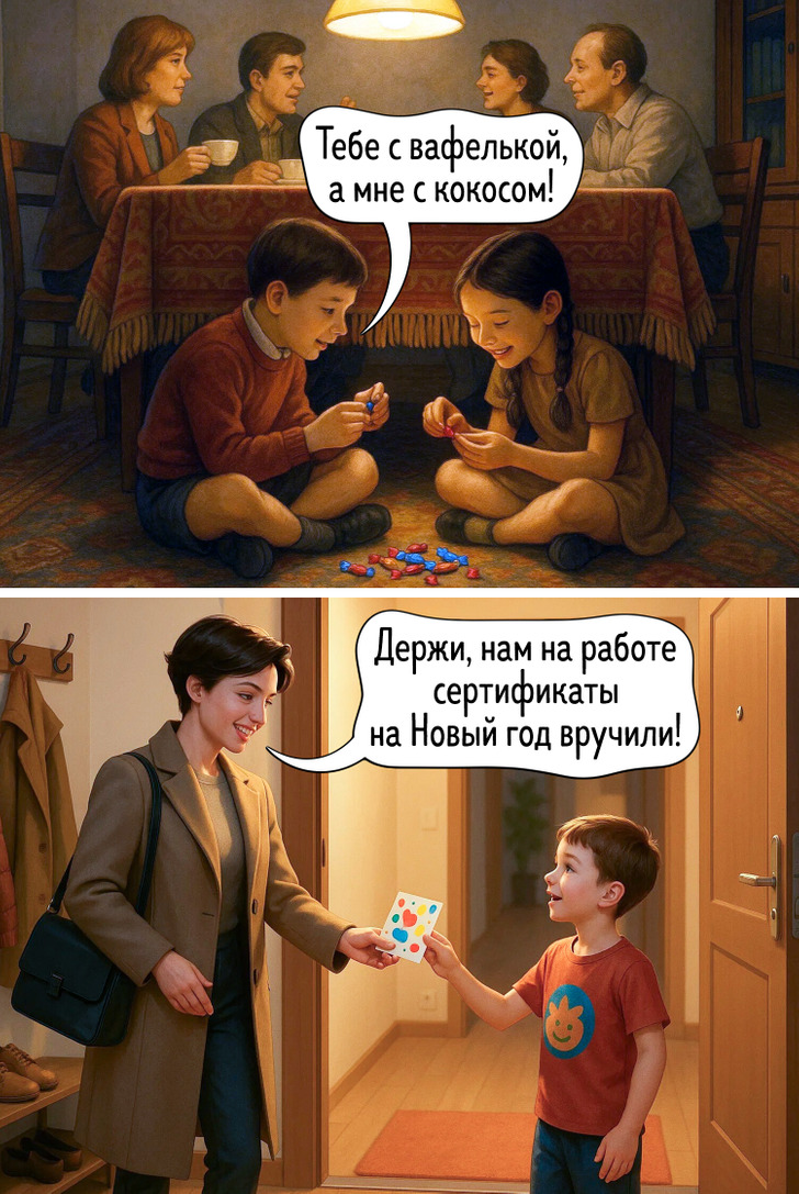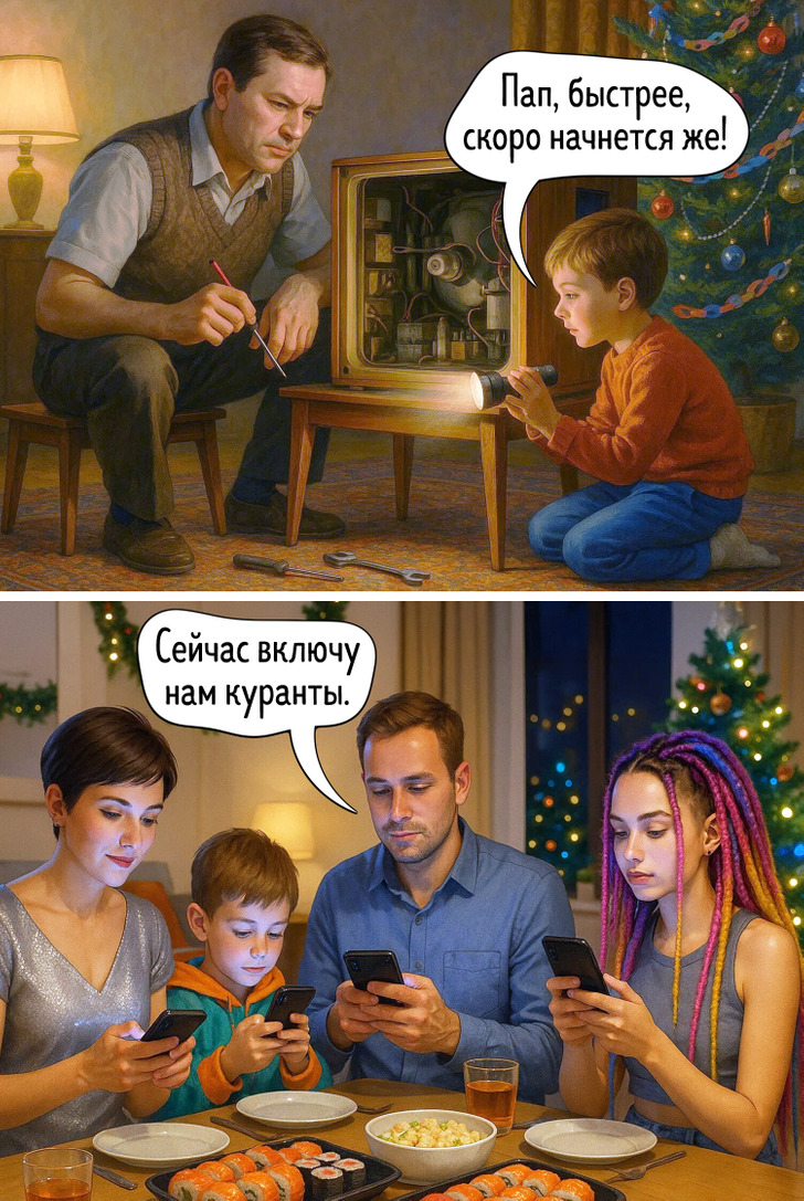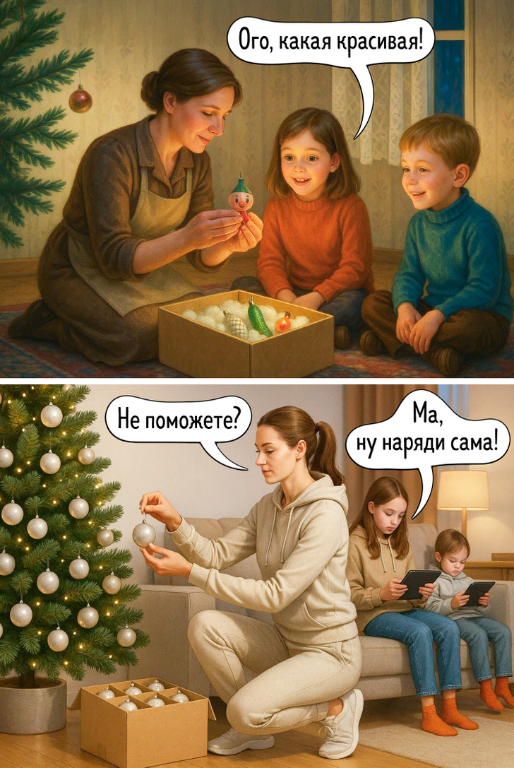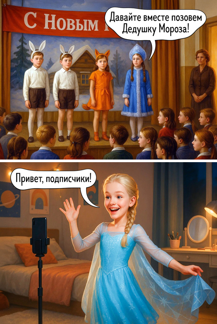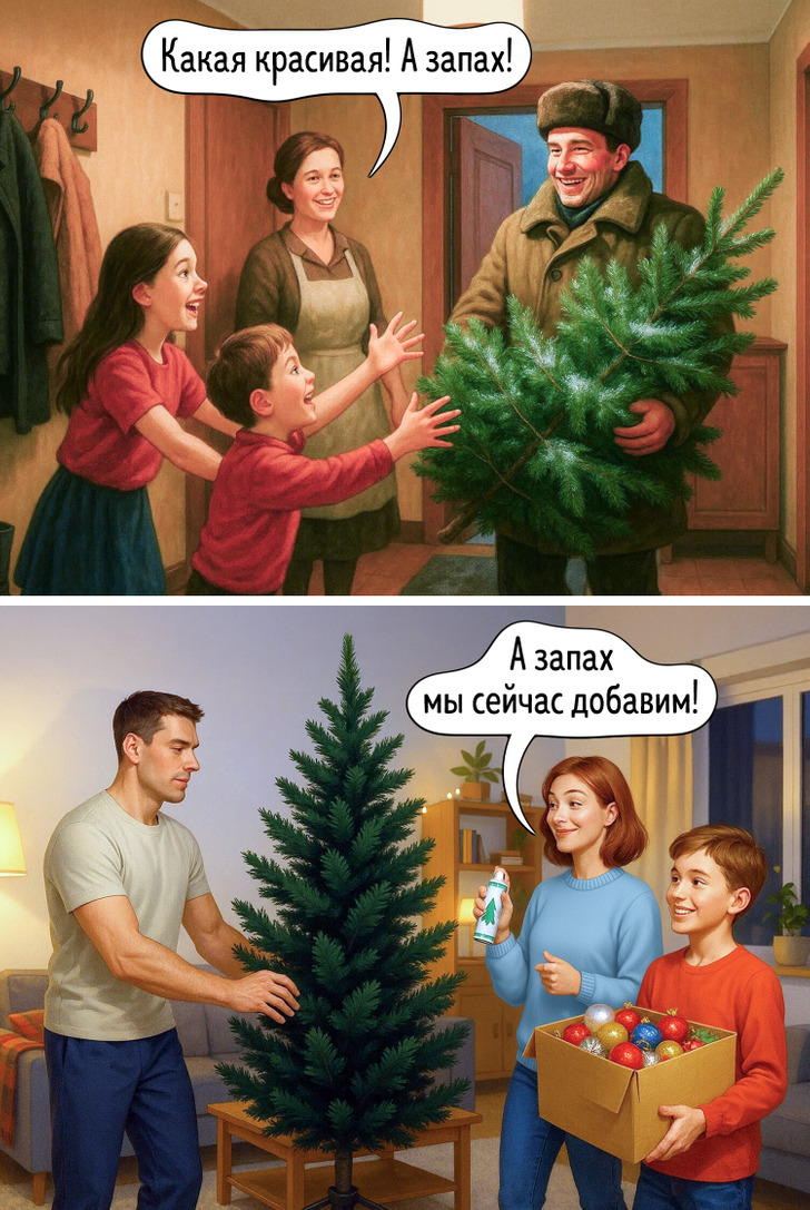 Наше представление о праздниках складывается из множества мелочей — запахов, вещей, привычек, которые когда-то казались обычными. Сегодня все выглядит иначе, и именно поэтому сравнение двух эпох становится таким наглядным. Эти иллюстрации показывают, как меняется быт, но остается само желание праздновать вместе.