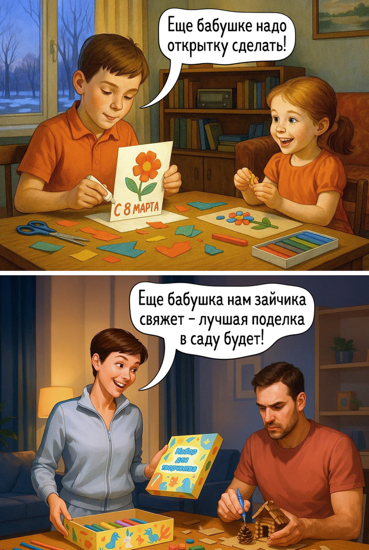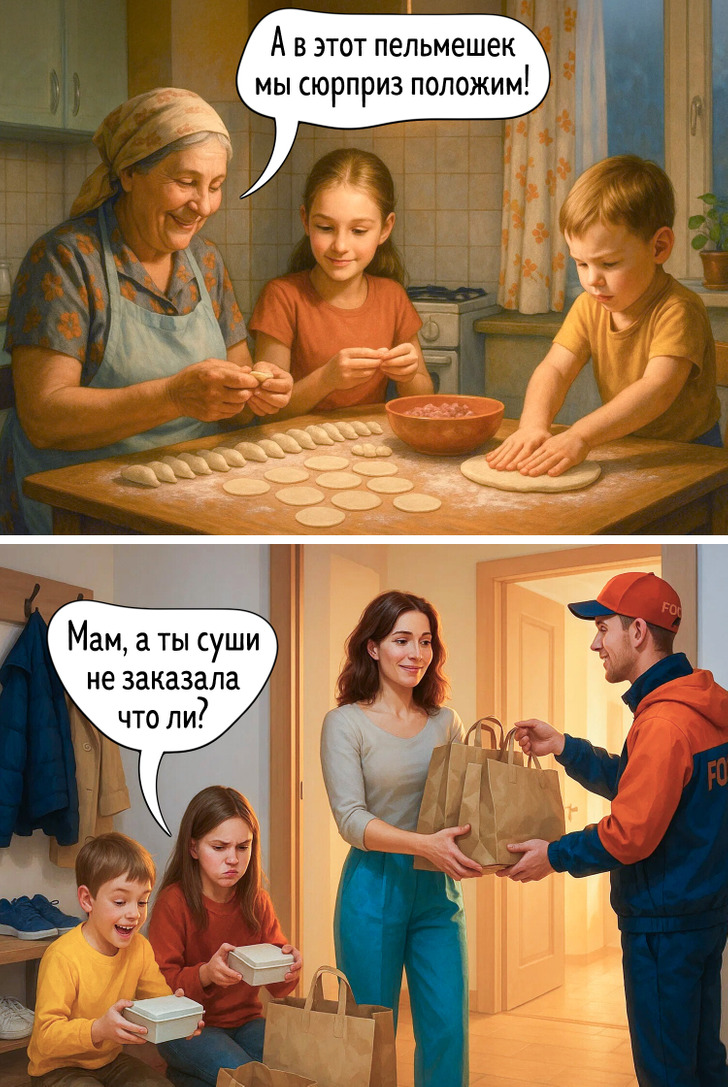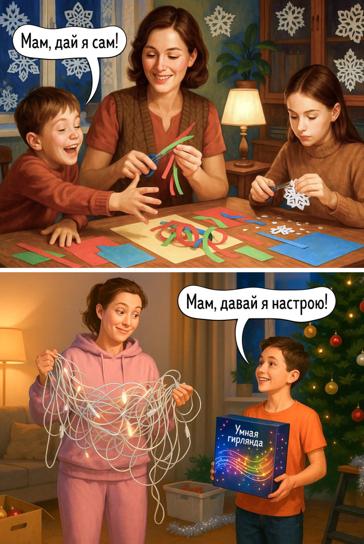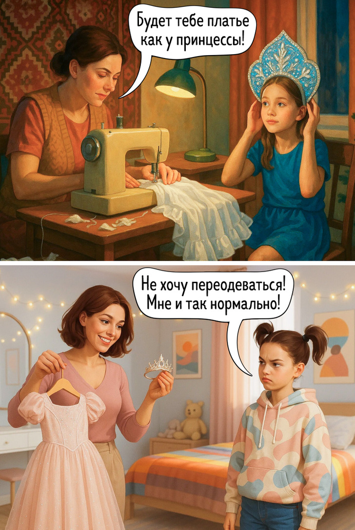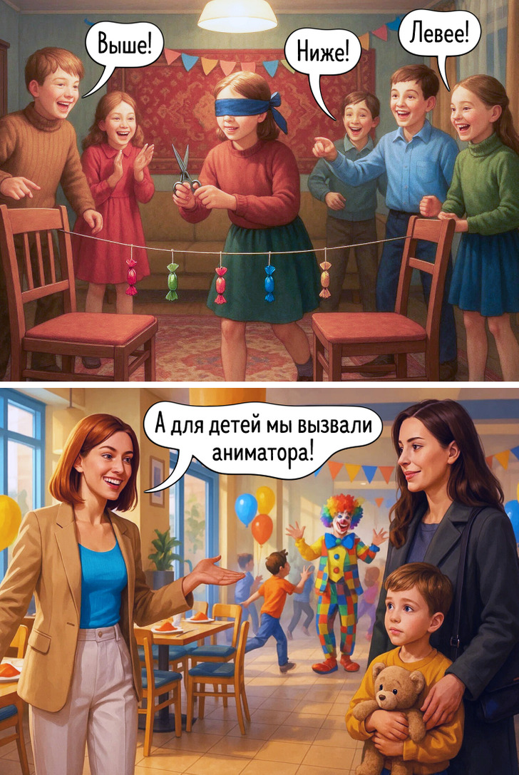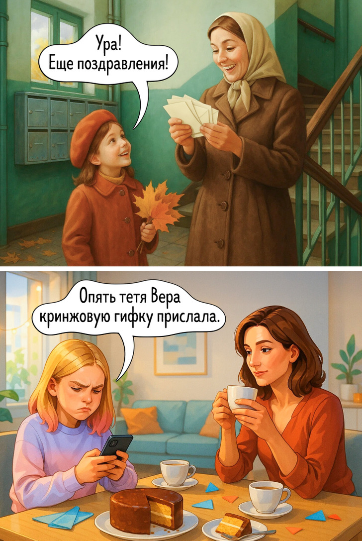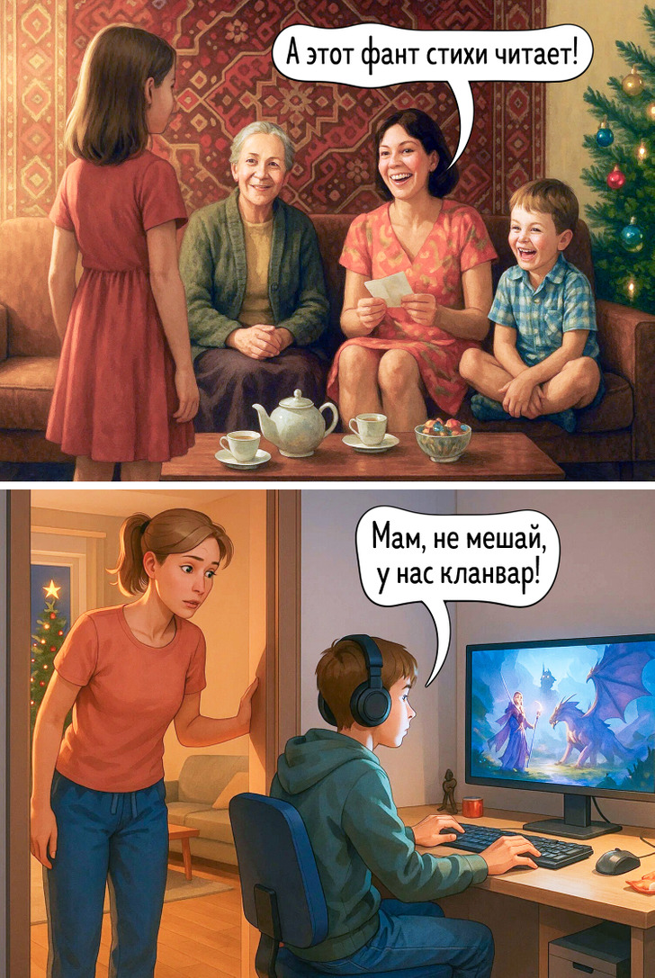 Наше представление о праздниках складывается из множества мелочей — запахов, вещей, привычек, которые когда-то казались обычными. Сегодня все выглядит иначе, и именно поэтому сравнение двух эпох становится таким наглядным. Эти иллюстрации показывают, как меняется быт, но остается само желание праздновать вместе.