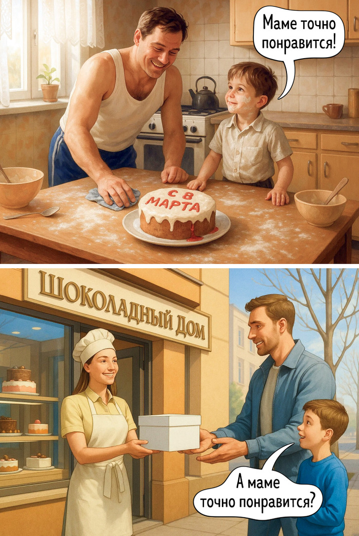 Испеченные нами в детстве торты бывали кривоваты, зато пекли мы их с душой. Теперь мы заранее заказываем идеальную выпечку и тихо надеемся, что они придутся по вкусу.