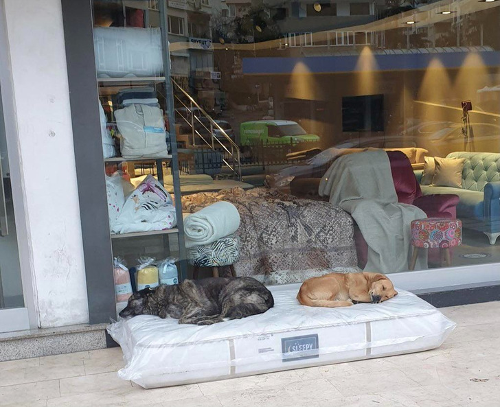 «Хозяин мебельного магазина оставил новый матрас для уличных собак — чтобы они могли спокойно поспать»