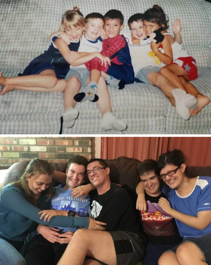 Друзья детства повторили старую фотографию, разница тут 13 лет