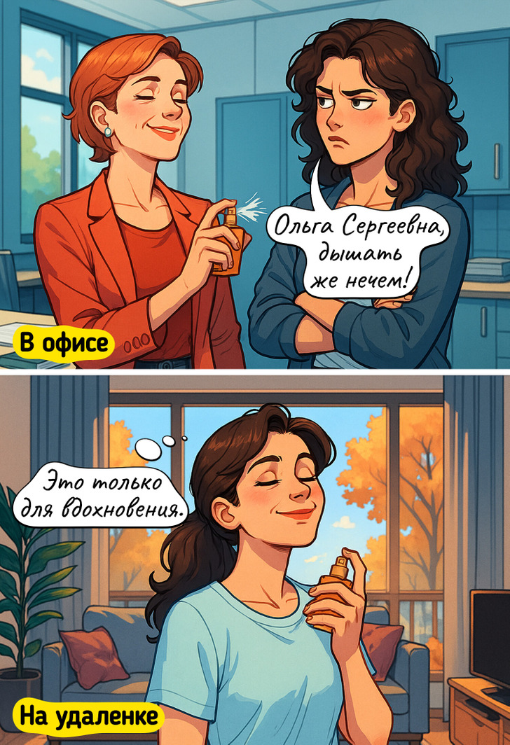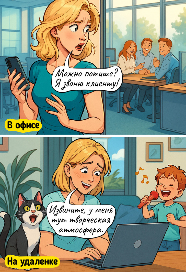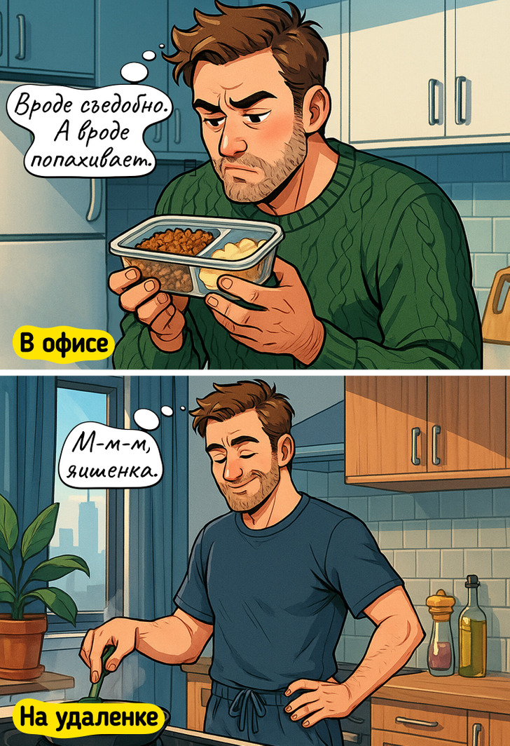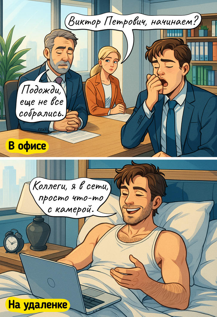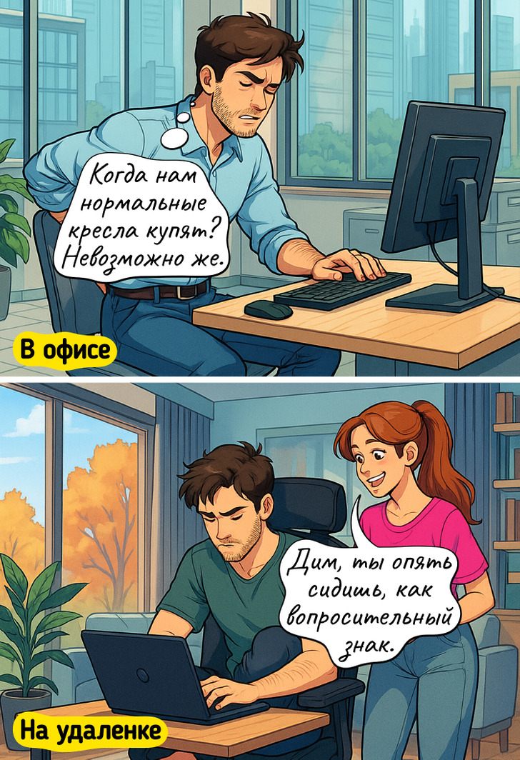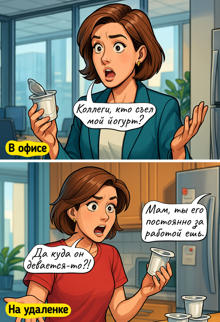 Шумные коллеги, споры из-за кондиционера, служебные романы и еда из микроволновки — это все про офис. А удобная пижама, завтрак ближе к вечеру и корпоративы в одиночестве — это уже про удаленку. Конечно, в каждом виде работы можно найти свои плюсы и минусы. Именно это мы и попробовали сделать в наших комиксах. А выбор, как говорится, всегда за вами.