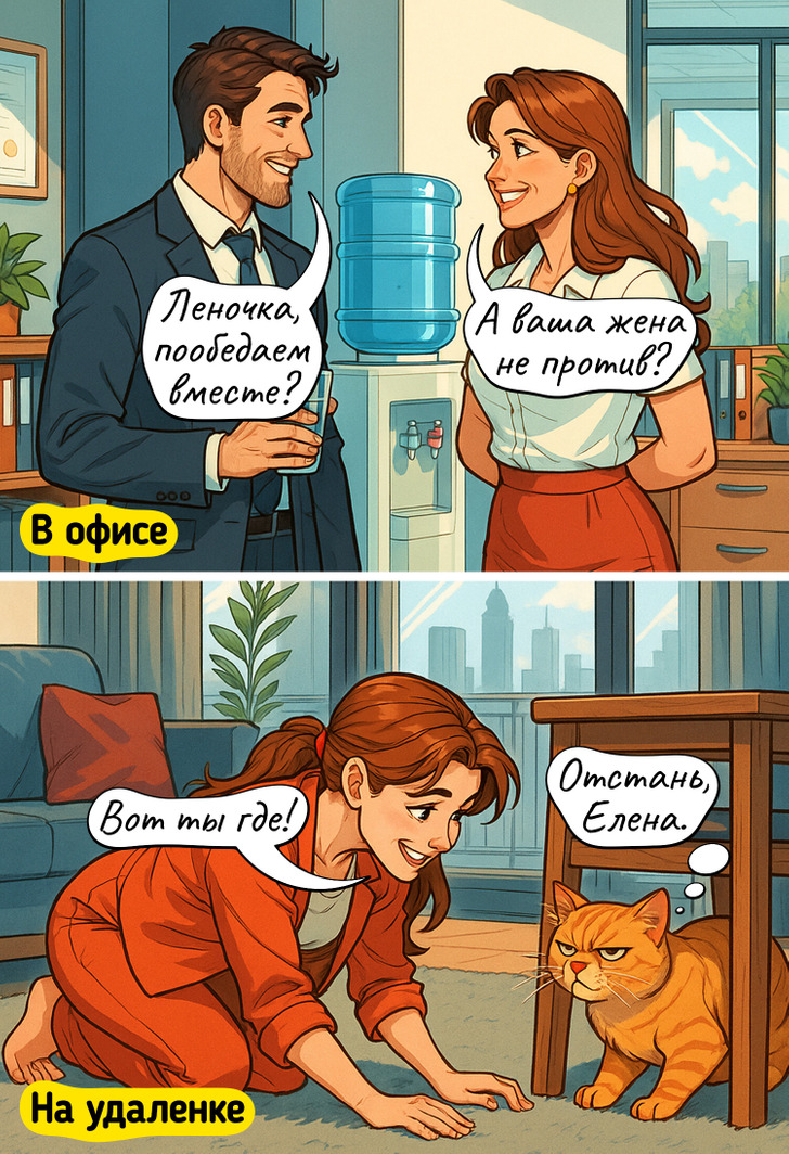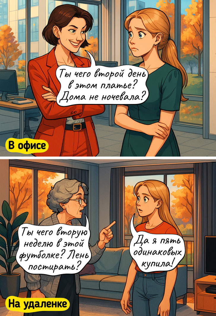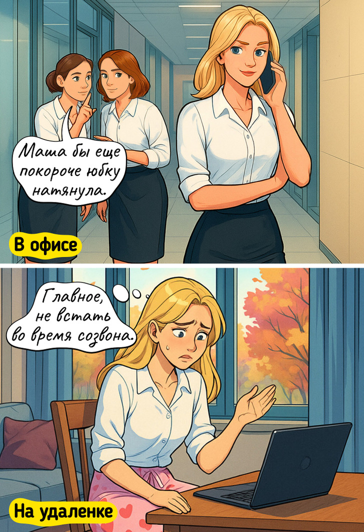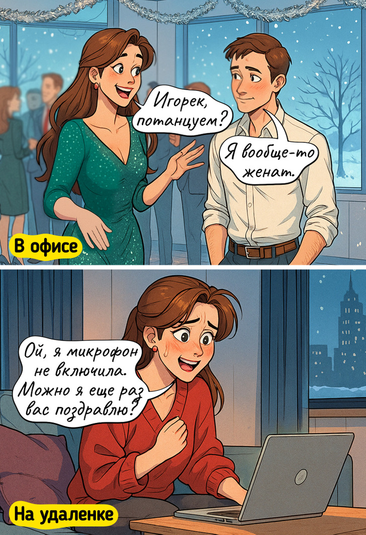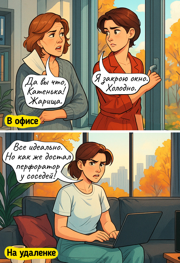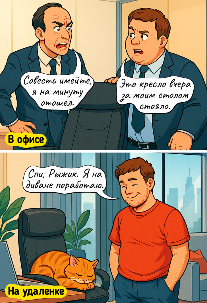 Шумные коллеги, споры из-за кондиционера, служебные романы и еда из микроволновки — это все про офис. А удобная пижама, завтрак ближе к вечеру и корпоративы в одиночестве — это уже про удаленку. Конечно, в каждом виде работы можно найти свои плюсы и минусы. Именно это мы и попробовали сделать в наших комиксах. А выбор, как говорится, всегда за вами.