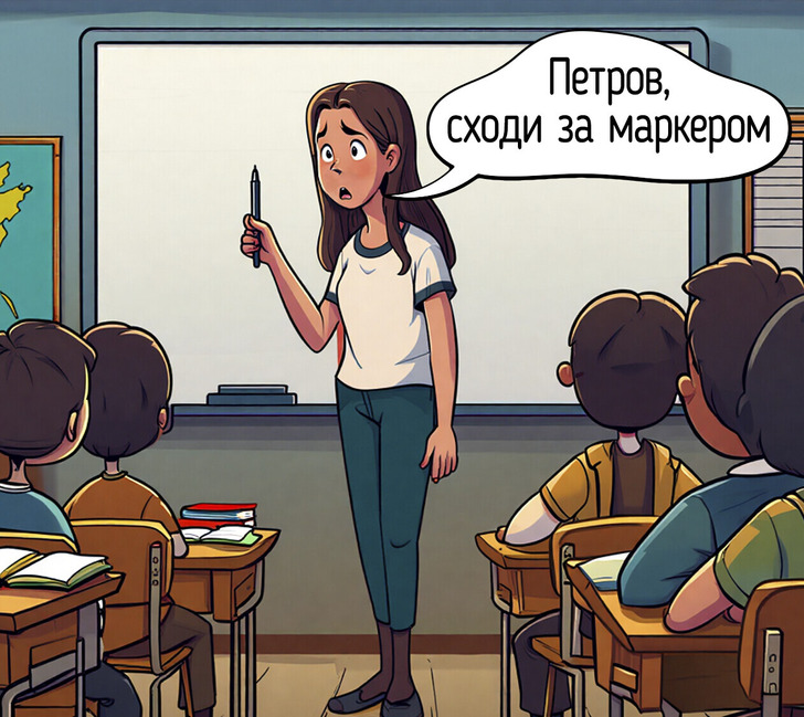 9. А вот что осталось неизменным, так это просьба учителя сходить за пишущим предметом. Только мы бегали за мелом, а наши дети — за маркером